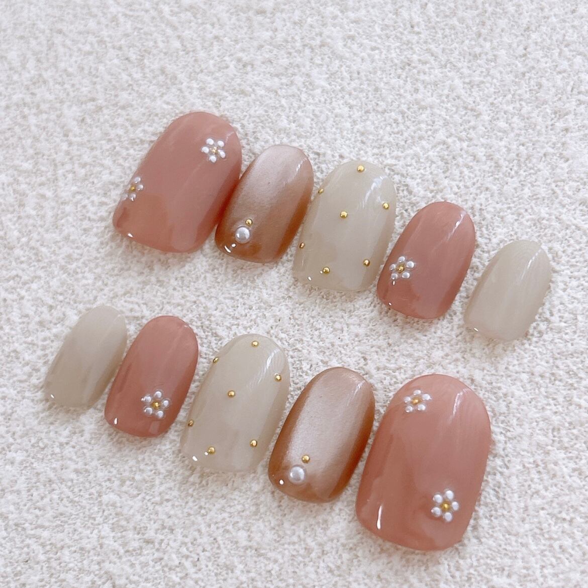 【最短翌日発送】ピンクベージュとパールのお花design♡ ネイル フラワー ピンク シンプル 大人可愛い ブライダル オフィス