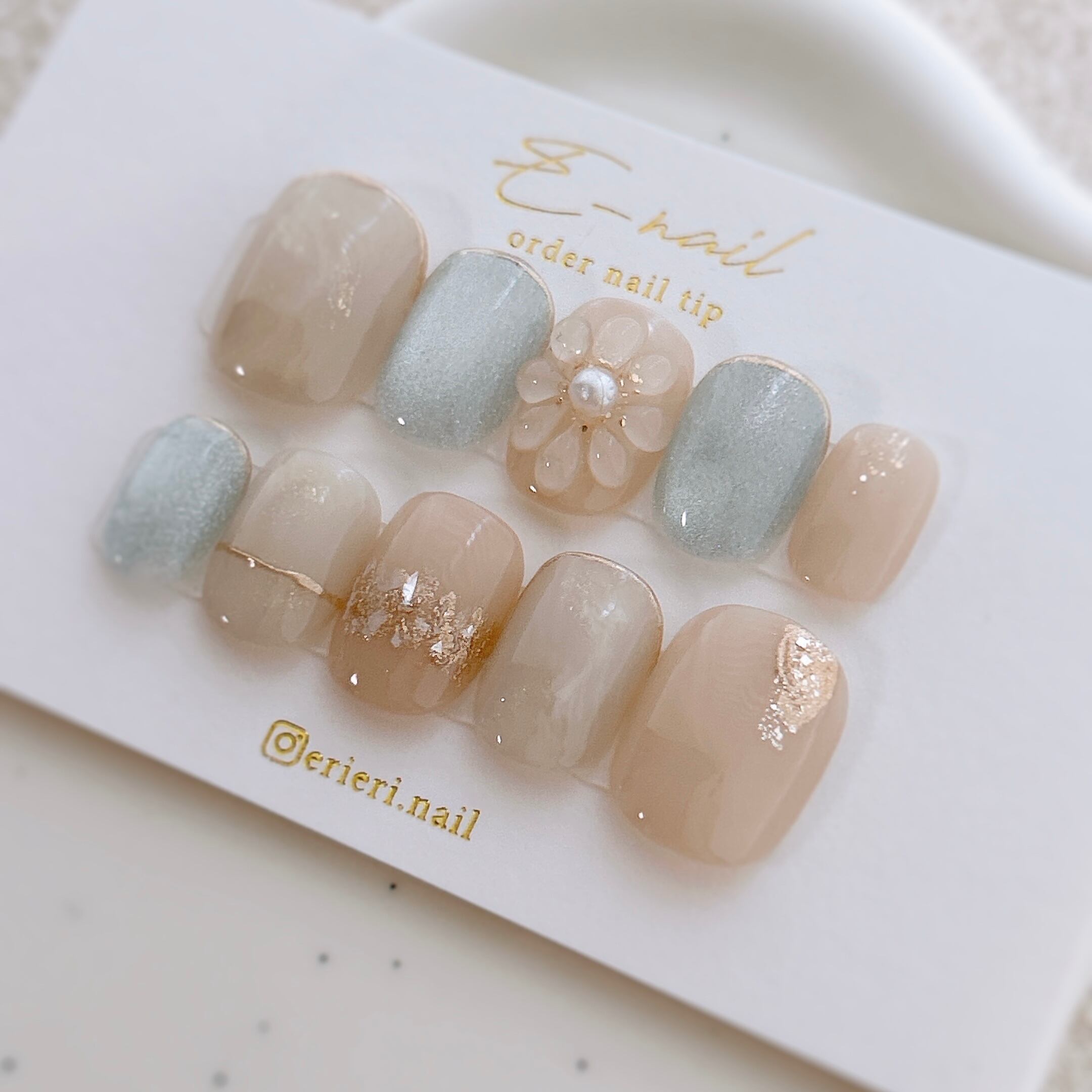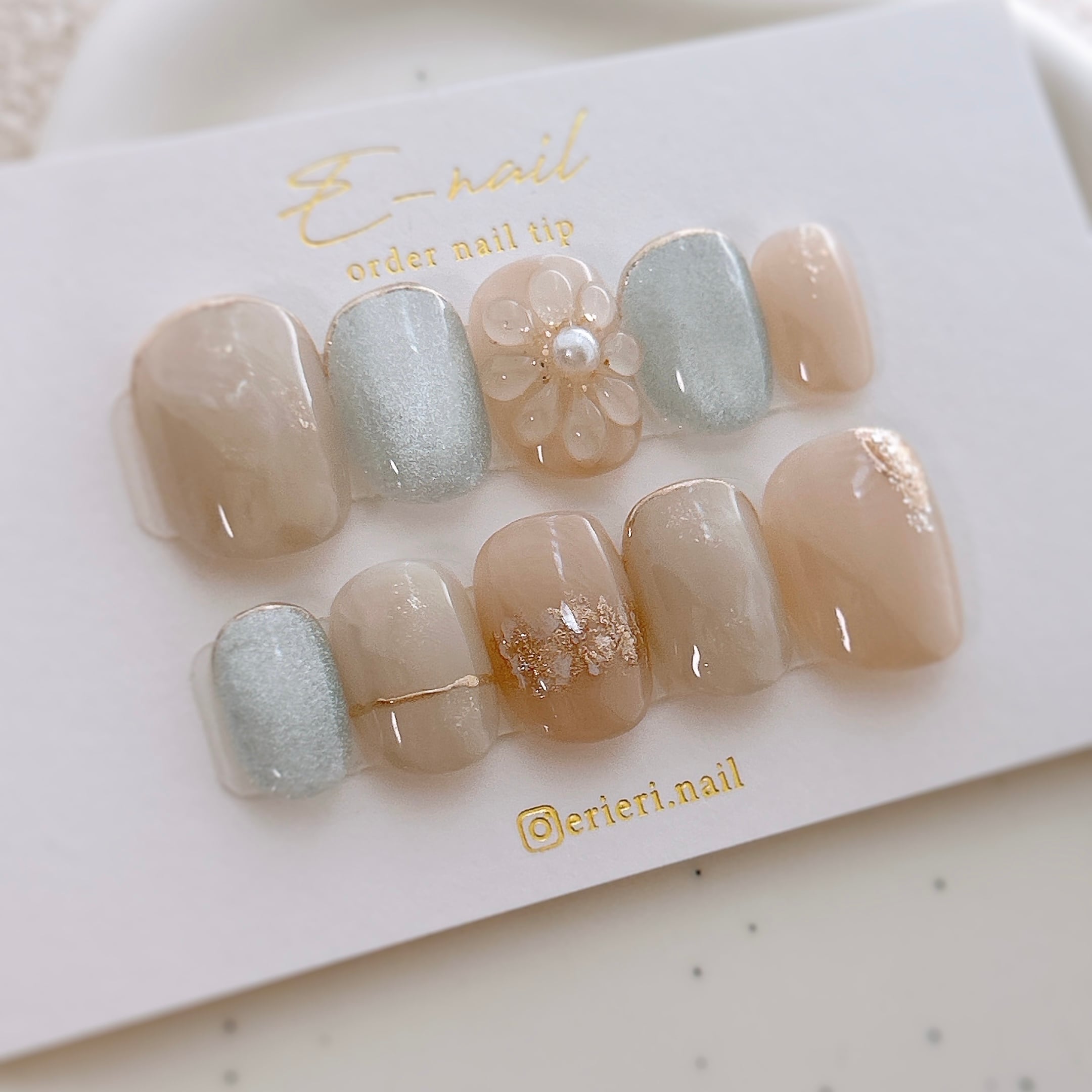 ぷるぷる透明感マグネット♡ ブルー アイボリー ぷっくりフラワー ブライダル シンプル 大人ネイル