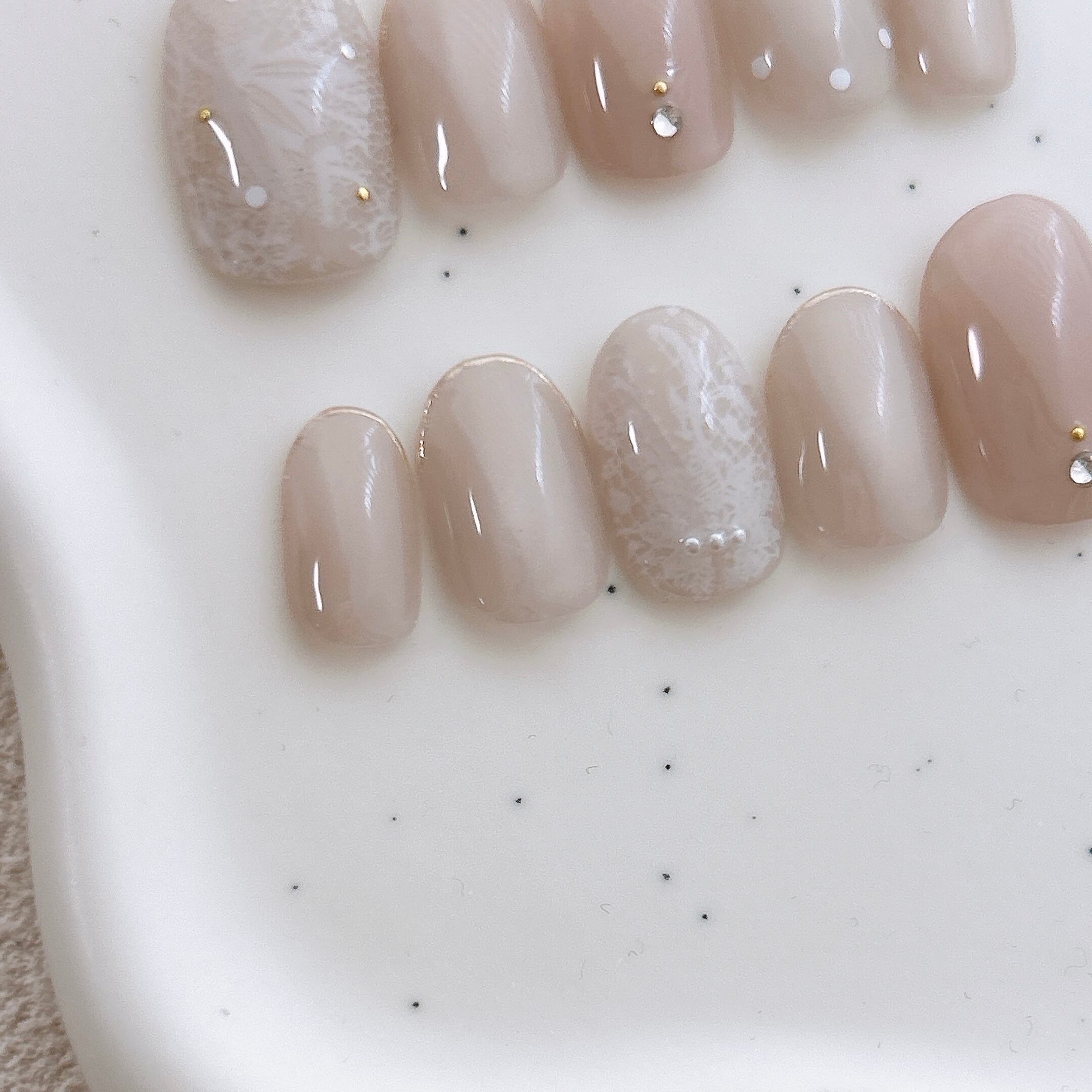 ふんわりレースデザイン ピンクベージュ シンプル 上品 ブライダル 大人可愛い 上品なネイル パール オフィス カジュアル