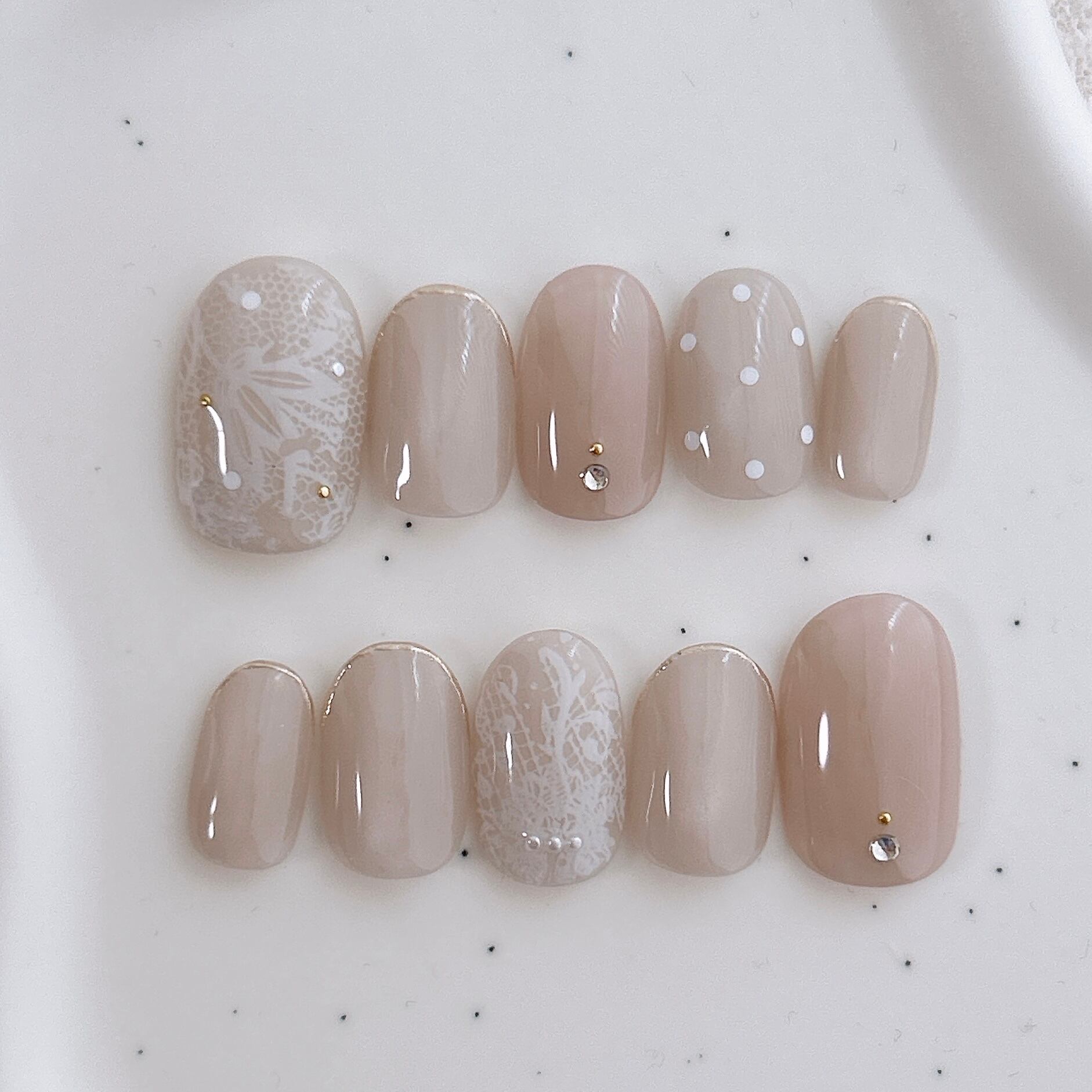 優しいピンクベージュとレースを合わせた上品ネイルです